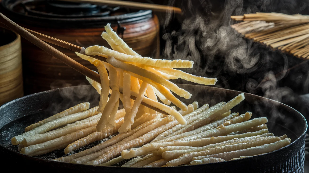 - 油炸工序:將切好的條狀麵糰放入溫度適中的油鍋中炸至金黃。這個過程需要嚴格控制油溫和時間,以確保寸棗既能充分酥脆,又不會過度焦黃。